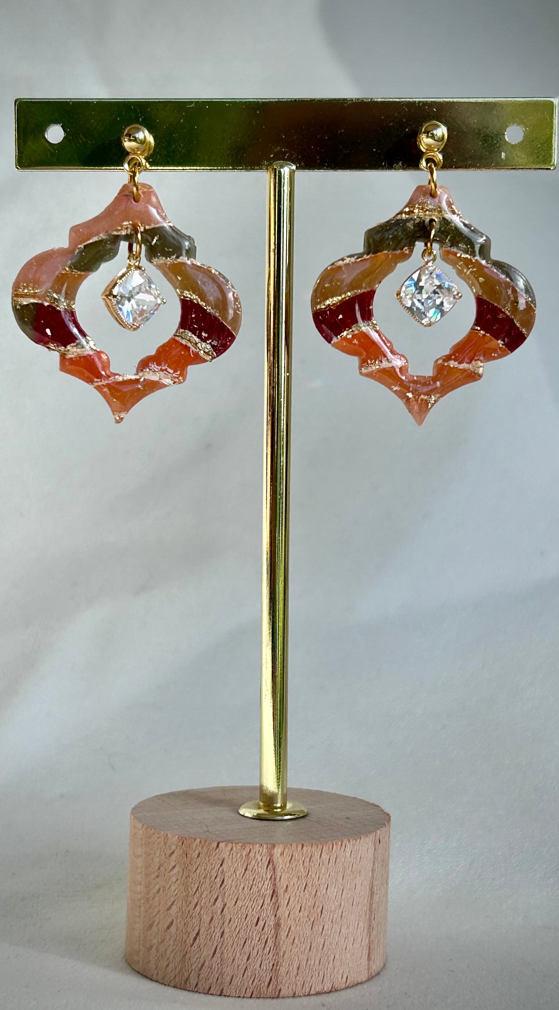 Lager på lager i härliga höstfärger med lite guld mellan skapades dessa örhängen i transparent lera. Baskomponenter i 18 k guldpläterad rostfritt stål. Örhänget glansiga yta är resin.