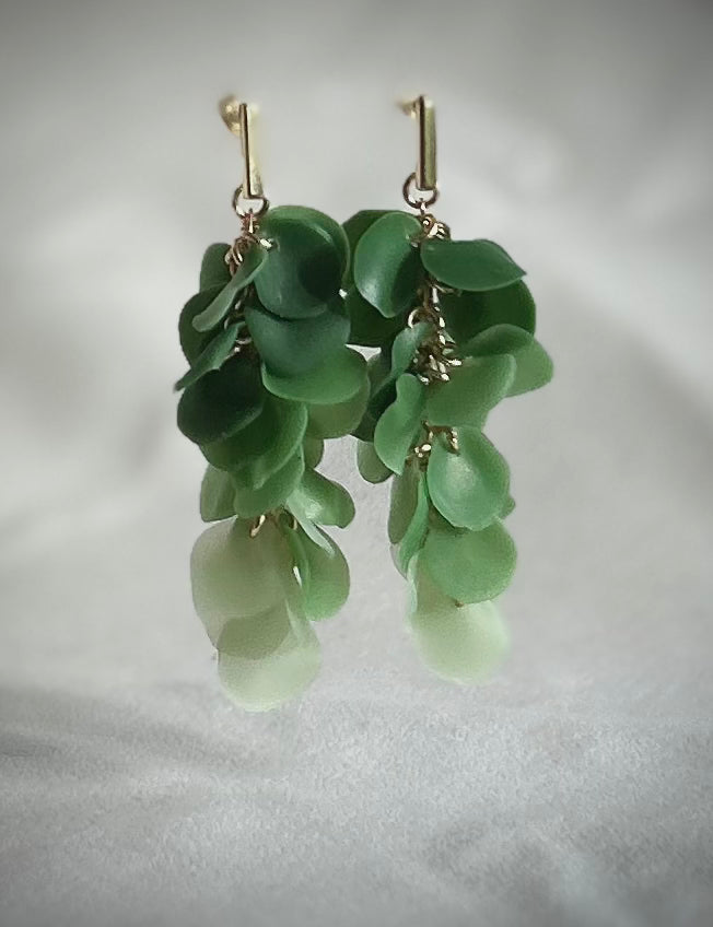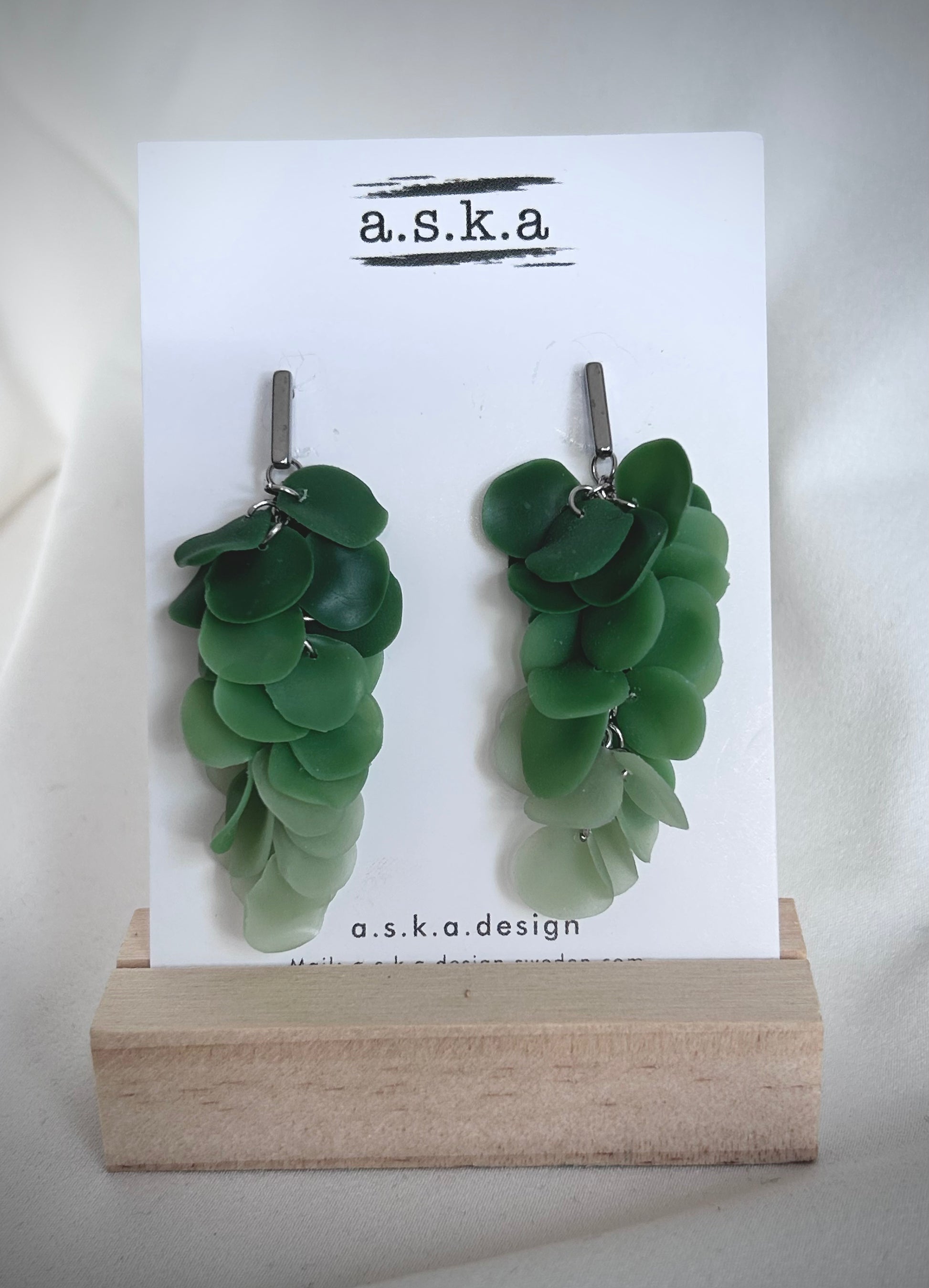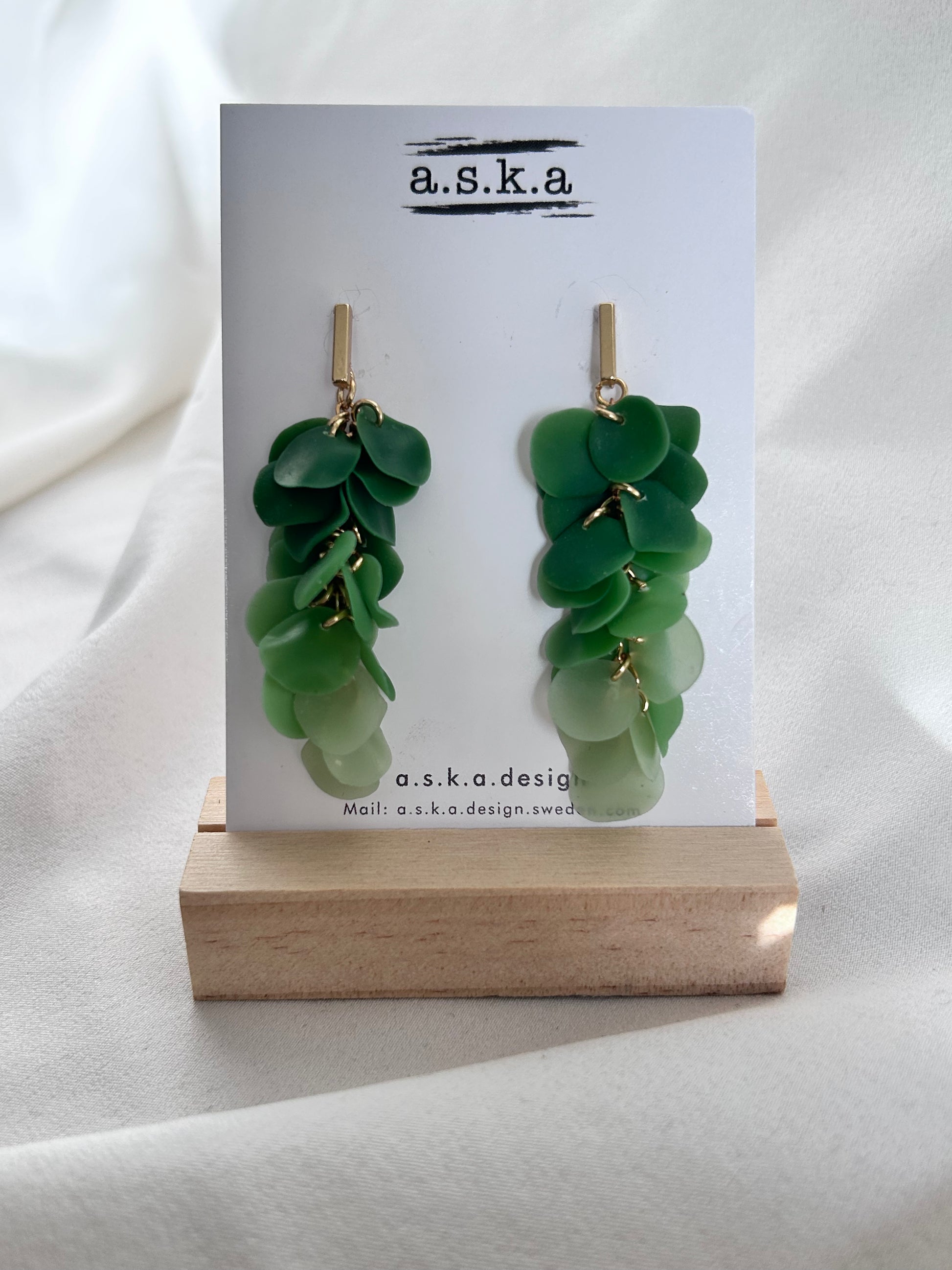 En kaskad av löv i fadande grön färg. Cirka 20-25 formade löv på varje örhänge. Örhängets bas finns både i rostfritt stål och i 18 K guldplätterad rostfritt stål.