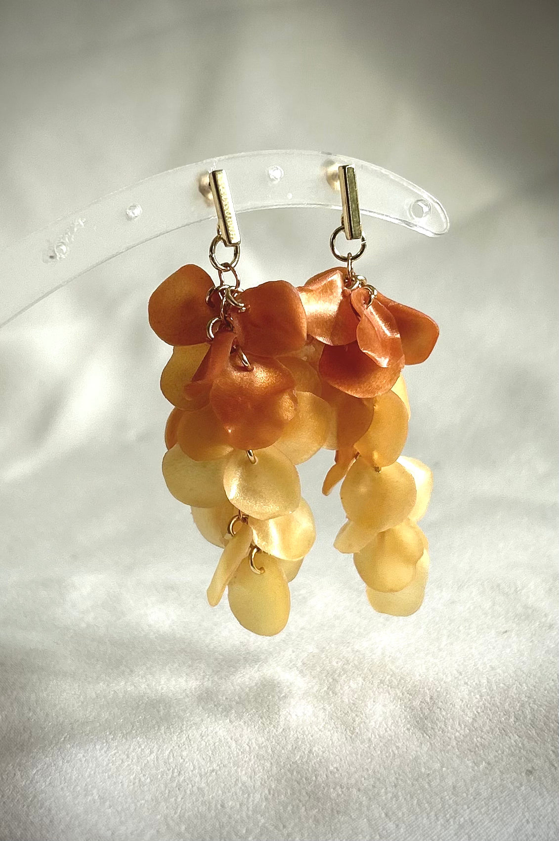 Som höstlöv faller dessa handformade löv ner på en bas 18k guldpläterad rostfritt stål.