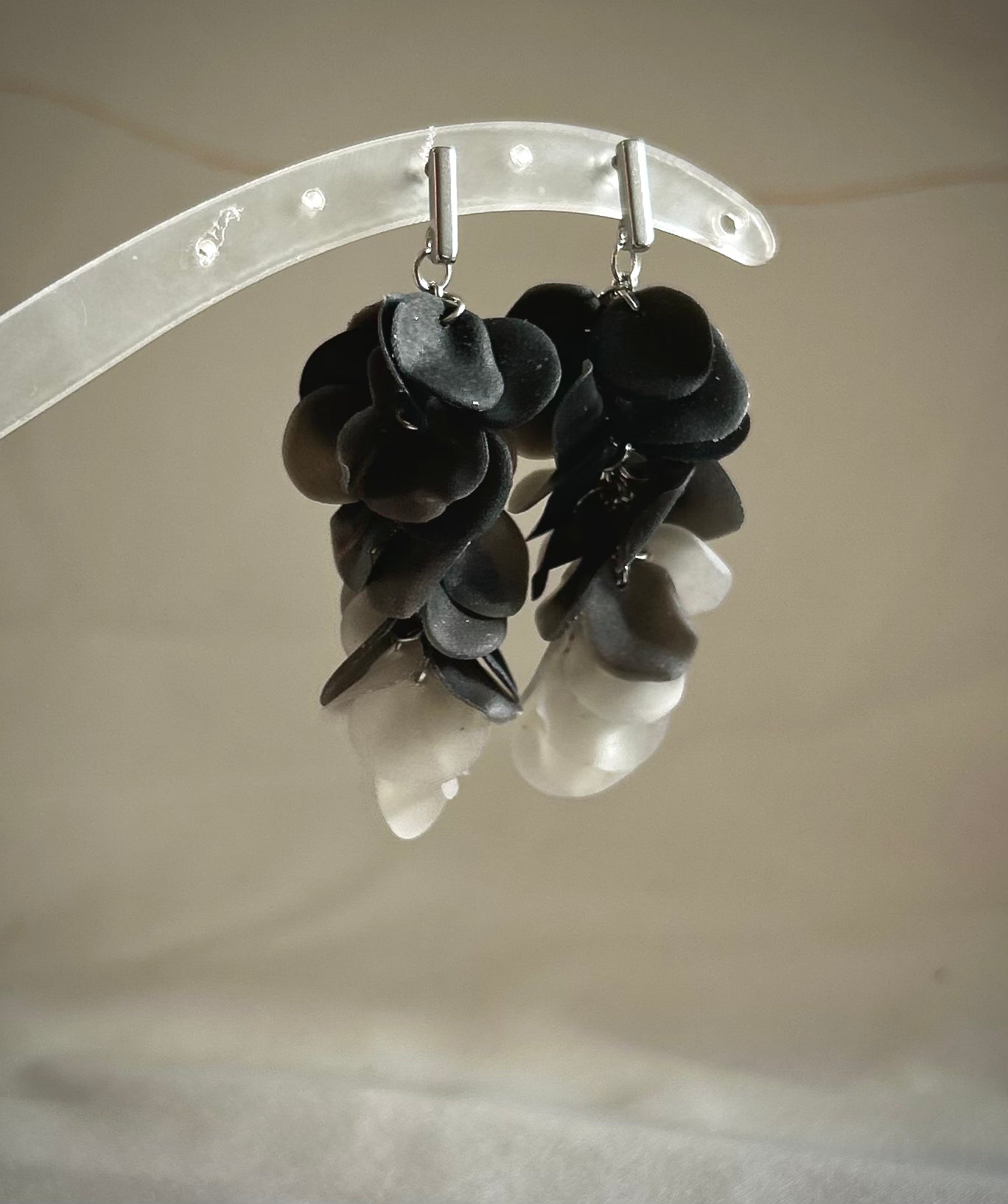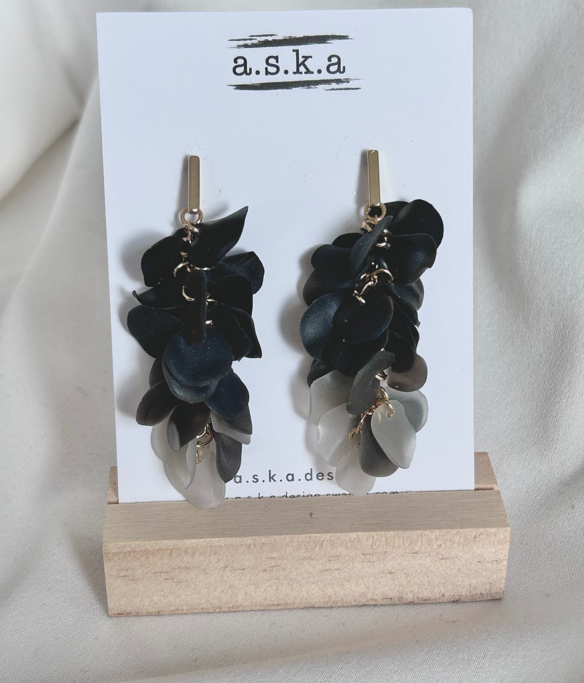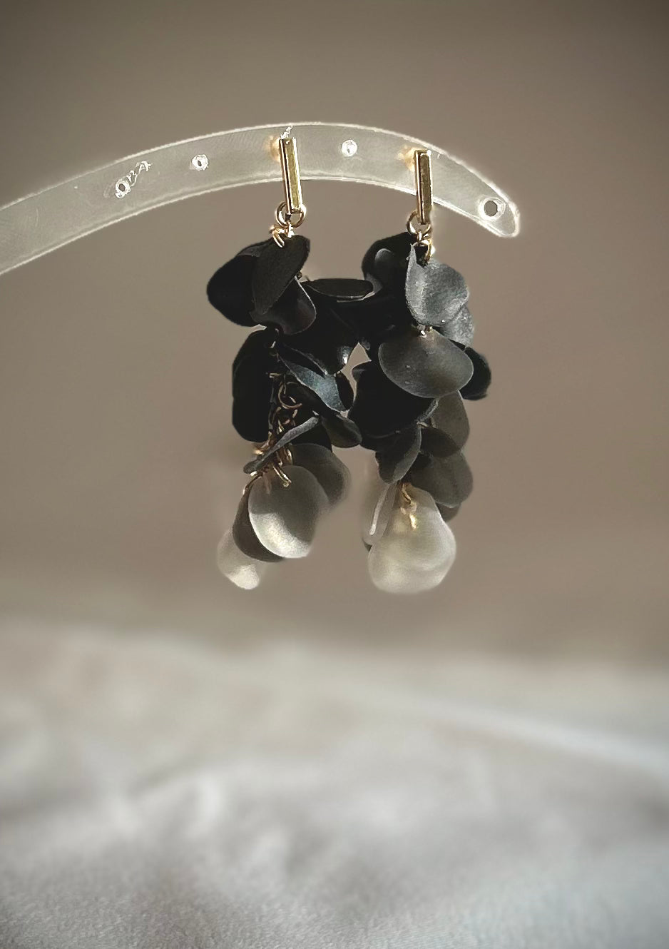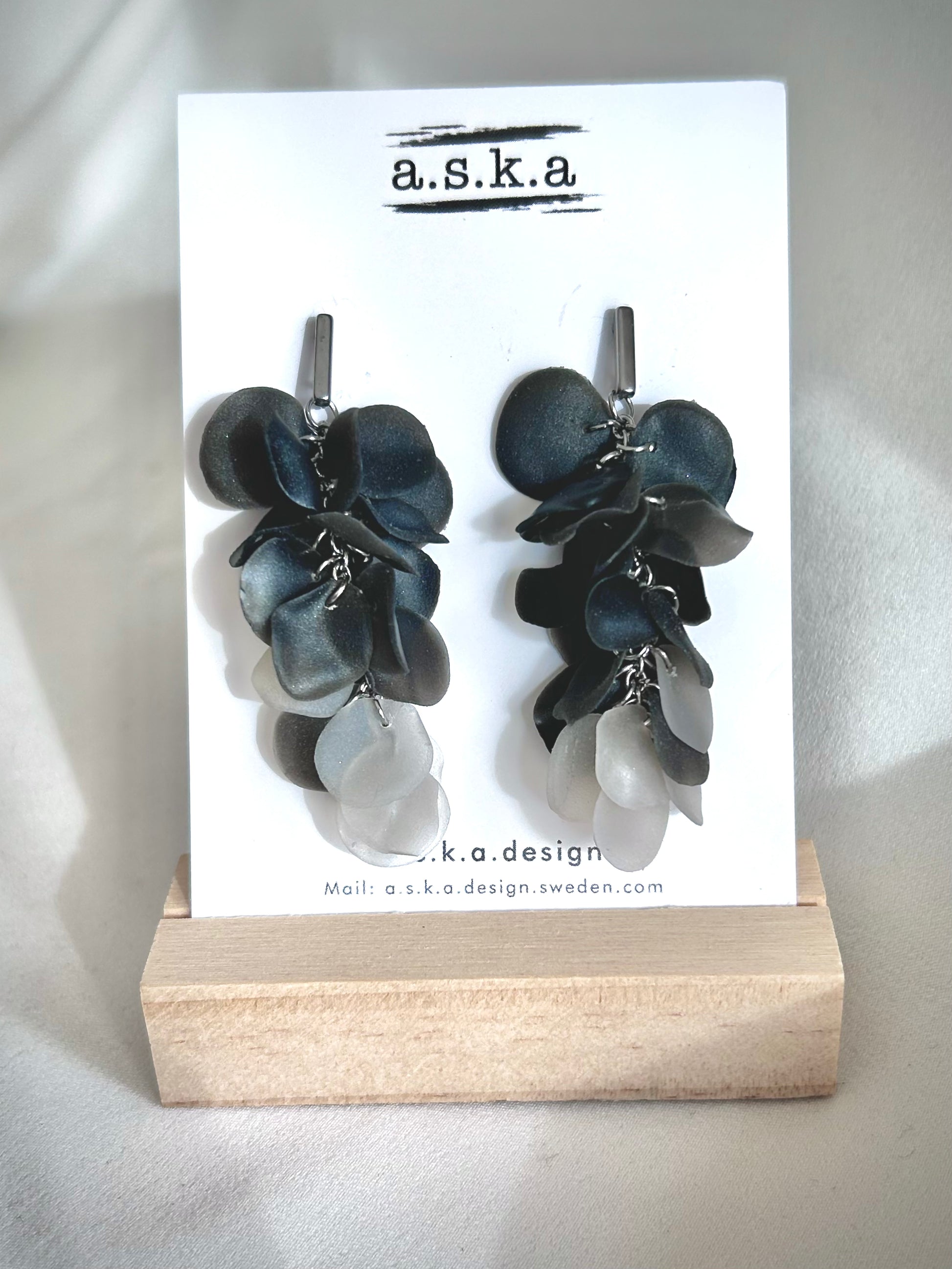 Svart är alltid rätt. 20-25 stycken formade löv hängandes på en bas av anting rostfritt stål eller 18k guldplätterat rostfritt stål.