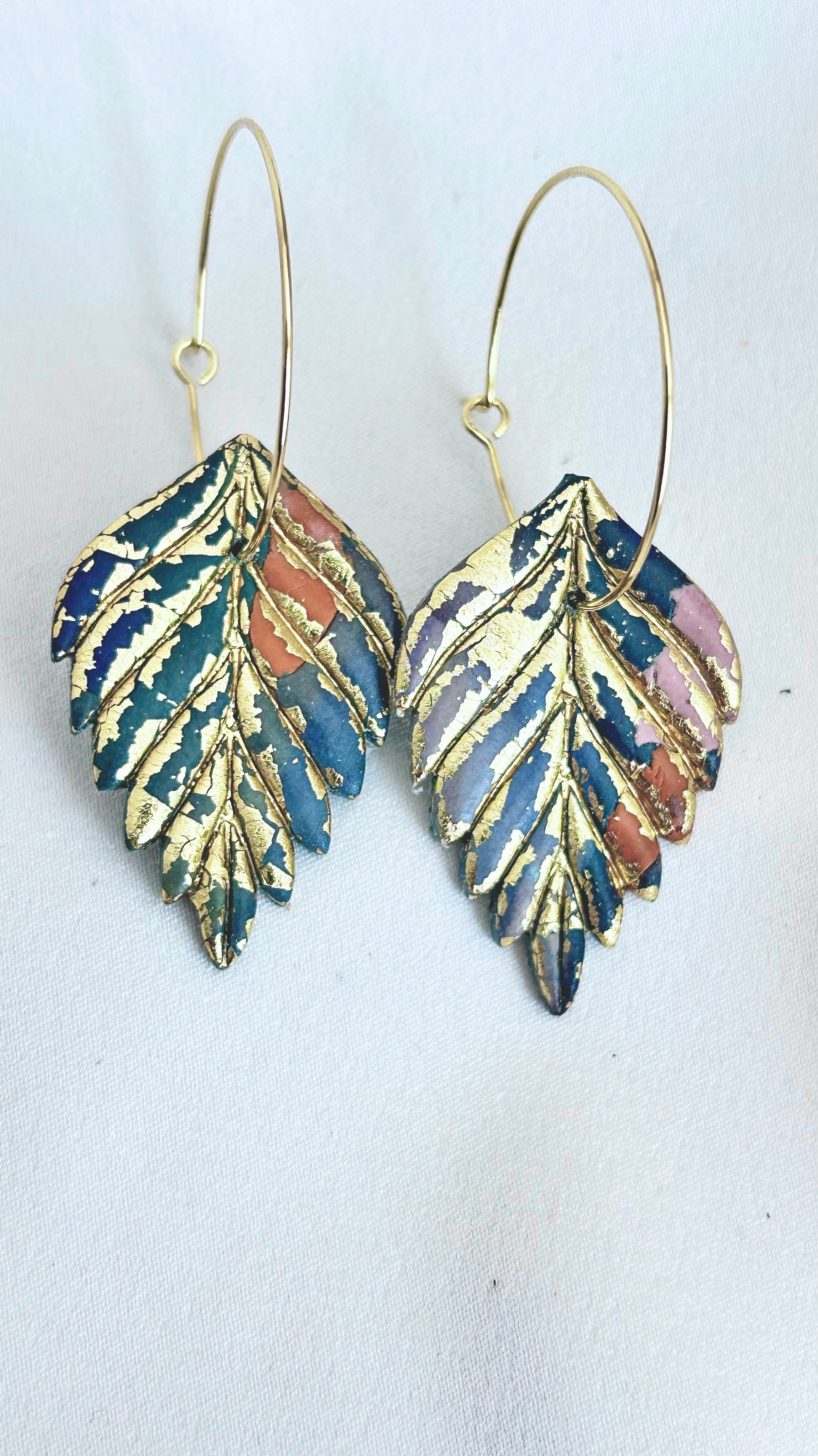 Ett flerfärgat löv med guldtouch där basen går i blått.