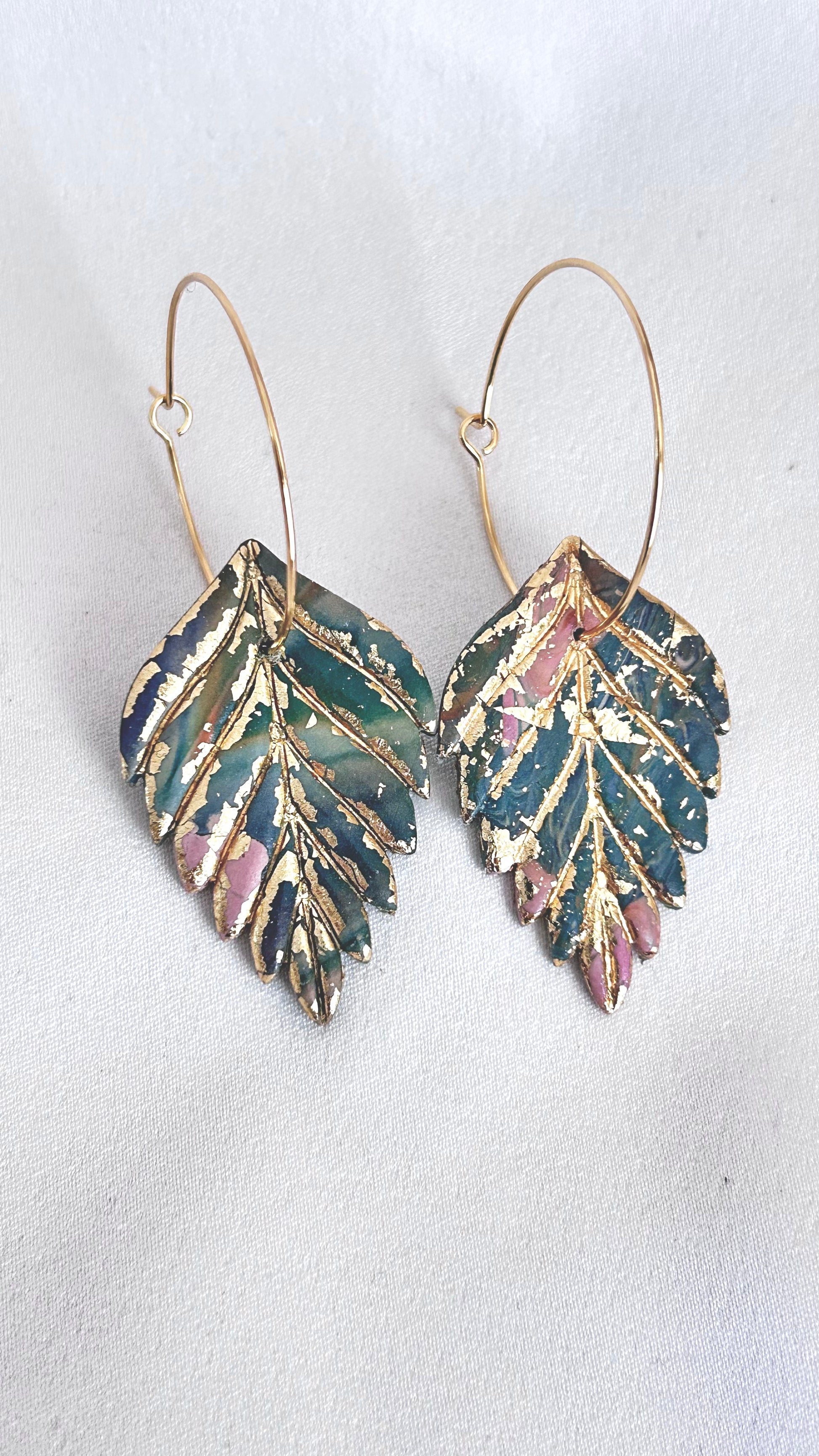 Flerfärgat löv med guldtouch där basen är grön med inslag av blått och rosa.