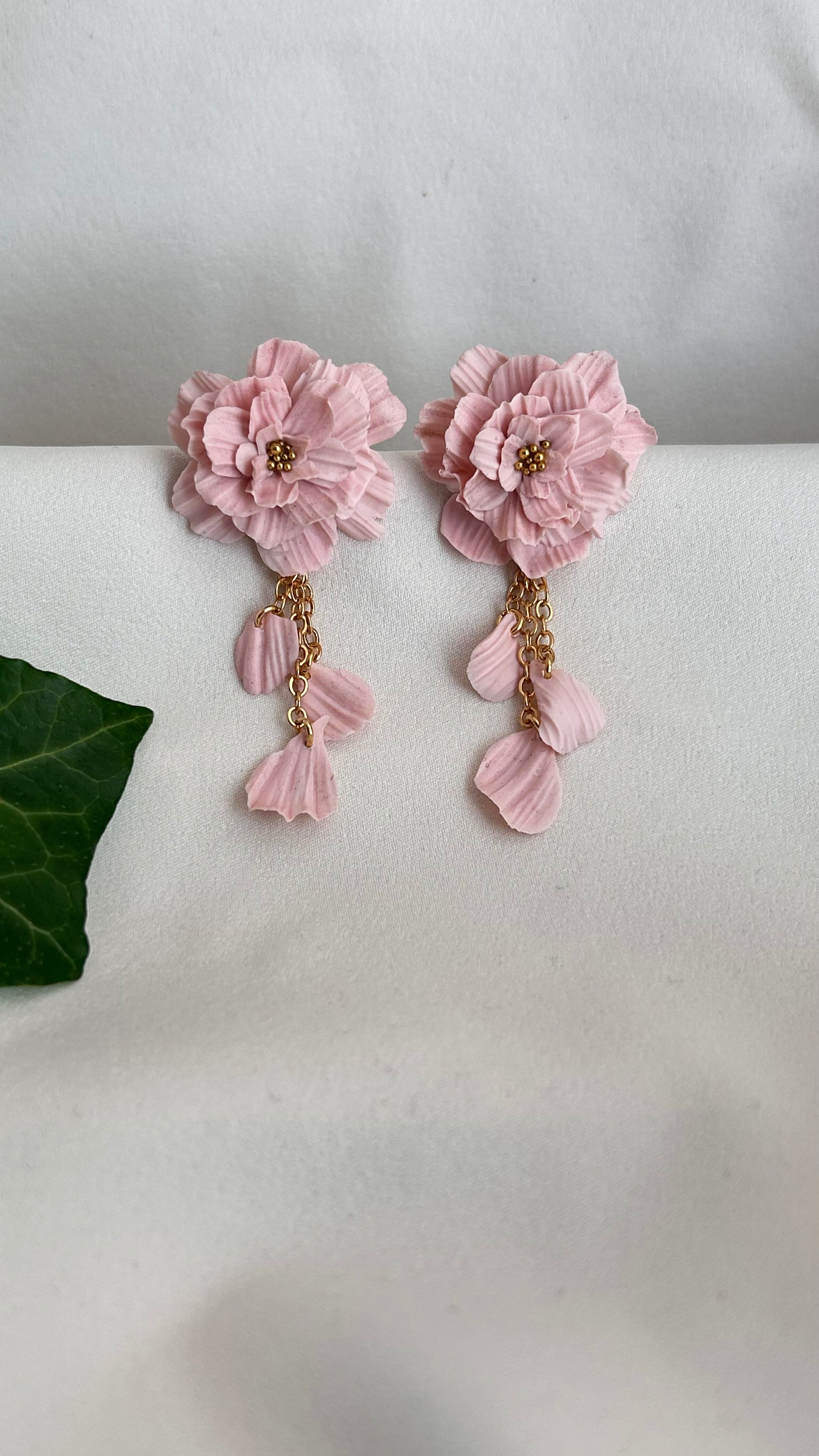 Handskulpterad blomma i rosa med hängande blad