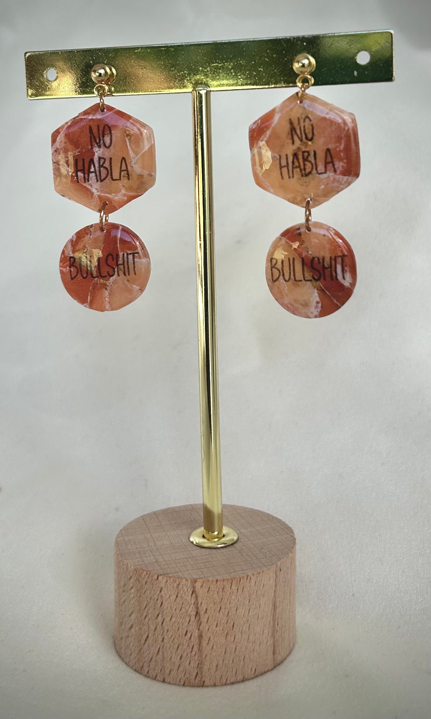 Ett mindre citat-örhänge i terracottafärgad marmorering.